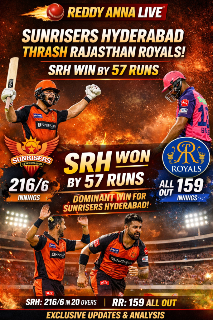 In a thrilling encounter in the ongoing Indian Premier League, Sunrisers Hyderabad delivered a commanding performance to defeat Rajasthan Royals by a convincing margin of 57 runs. The high-octane clash showcased explosive batting, disciplined bowling, and sharp fielding, reinforcing Hyderabad’s growing dominance this season.